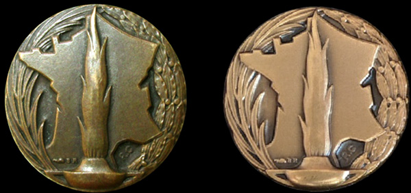 L'insigne uniface, frappé en bronze patiné et du module de 23 mm, représente la flamme du souvenir s’élevant sur une carte de France encadrée d’une palme et d’une branche d’olivier.