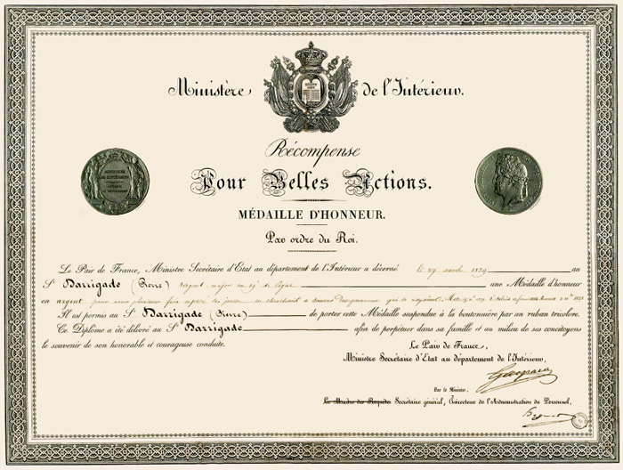 Diplôme remis en 1840 pour une " Médaille des Belles actions "