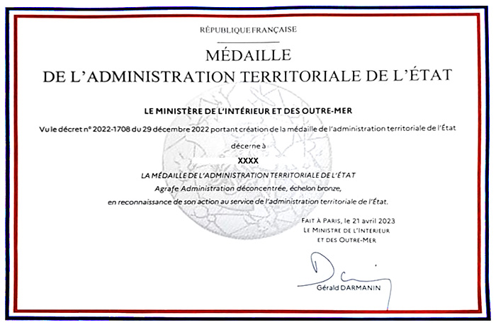 MÉDAILLE DE L'ADMINISTRATION TERRITORIALE DE L'ÉTAT