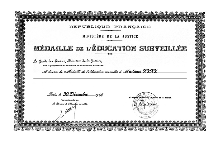 Diplôme remis en 1968 pour une médaille de l'Education surveillée