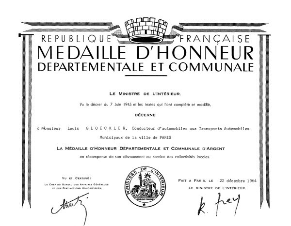 Diplôme d'une médaille d'honneur départementale et communale, échelon Argent, décerné en 1964