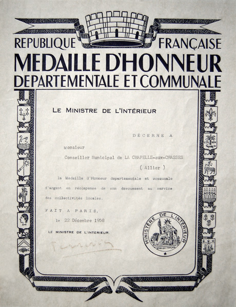Diplôme d'une médaille d'honneur départementale et communale, échelon Argent, décerné en 1958