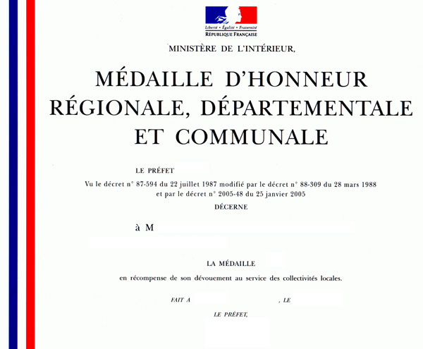 Diplôme type d'une médaille d'honneur régionale, départementale et communale, décerné en 2013