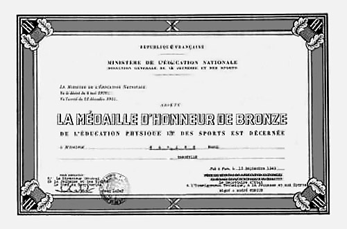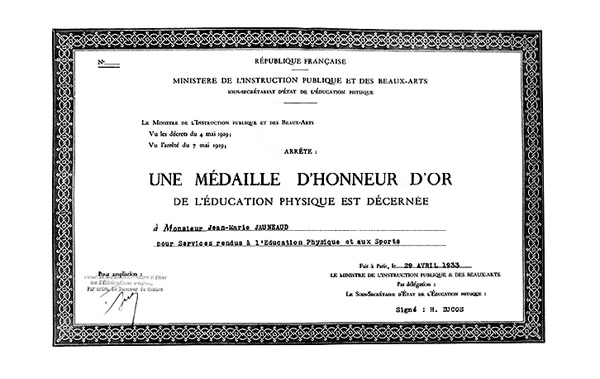Diplôme de la Médaille d'honneur de l'Éducation physique et des Sports,