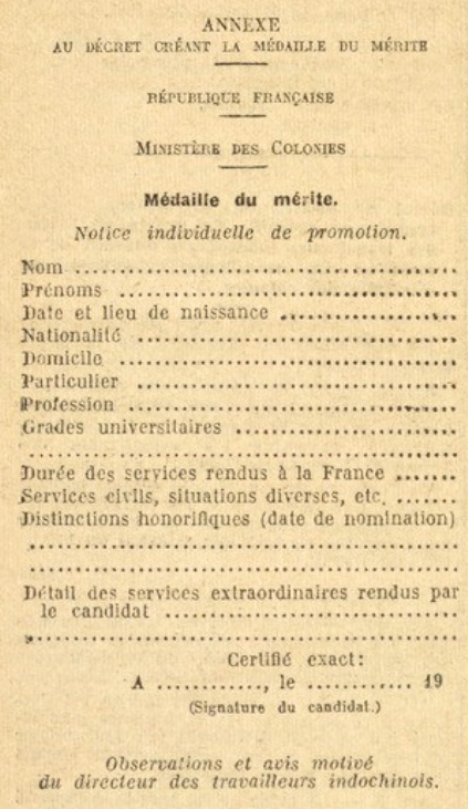 Le 22 septembre 1945, le gouvernement provisoire de la République française créait une médaille du Mérite, destinée à récompenser les travailleurs indochinois, relevant de la direction des travailleurs indochinois du ministère des colonies, qui s'étaient distingués par leur valeur professionnelle et leur comportement depuis leur arrivée dans la métropole.