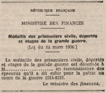 Vu l'article 7 de la loi du 14 mars 1936 instituant une médaille des prisonniers civils, déportés et otages de la Grande Guerre ;