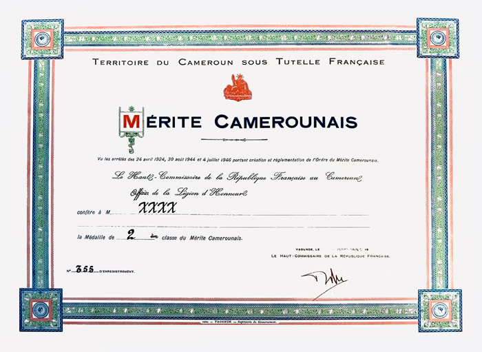 Brevet de l'Ordre du Mérite camerounais de 2e classe, décerné en 1953, pour un européen