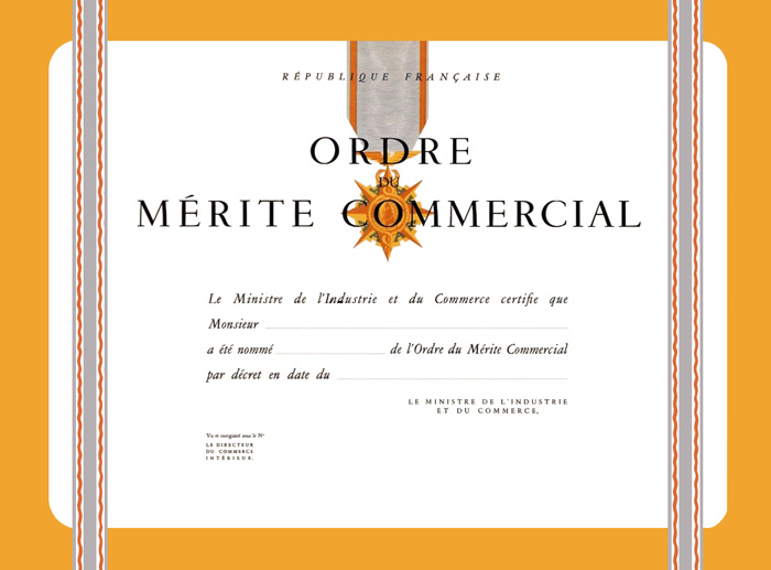 Ordre du Mérite Commercial – Modèle type de brevet vers 1950