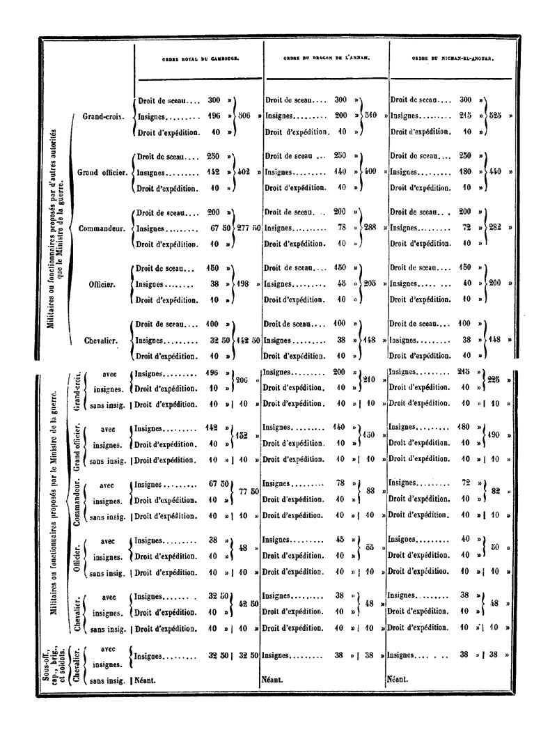 Le Président du conseil, Ministre de la guerre, sur la demande de M. le Sous-secrétaire d'État des colonies, porte à la connaissance des militaires de tous grades, ainsi que des fonctionnaires militaires et civils relevant du ministère de la guerre, le montant des droits qu'ils auront à acquitter, lorsqu'ils obtiendront les décorations du Nichan Iftikar de Tunis, de l'Ordre royal du Cambodge, de l'Ordre impérial du Dragon de l'Annam et du Nichan-el-Anouar ( Obock ).